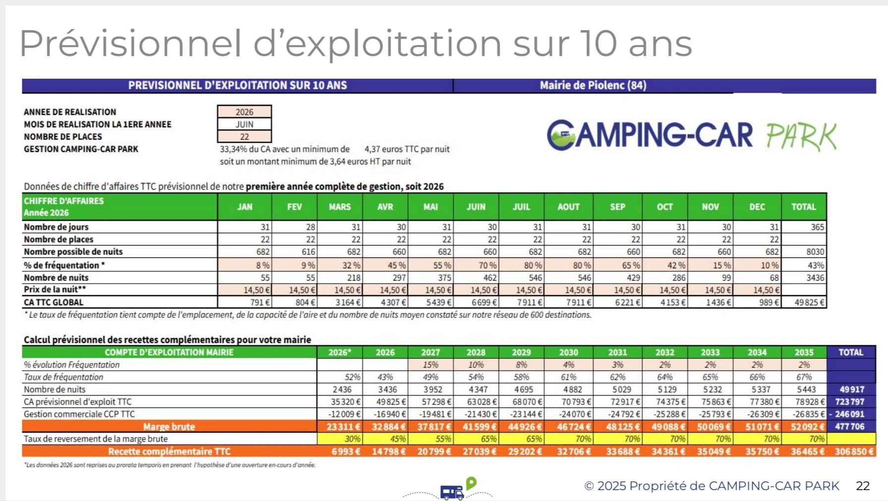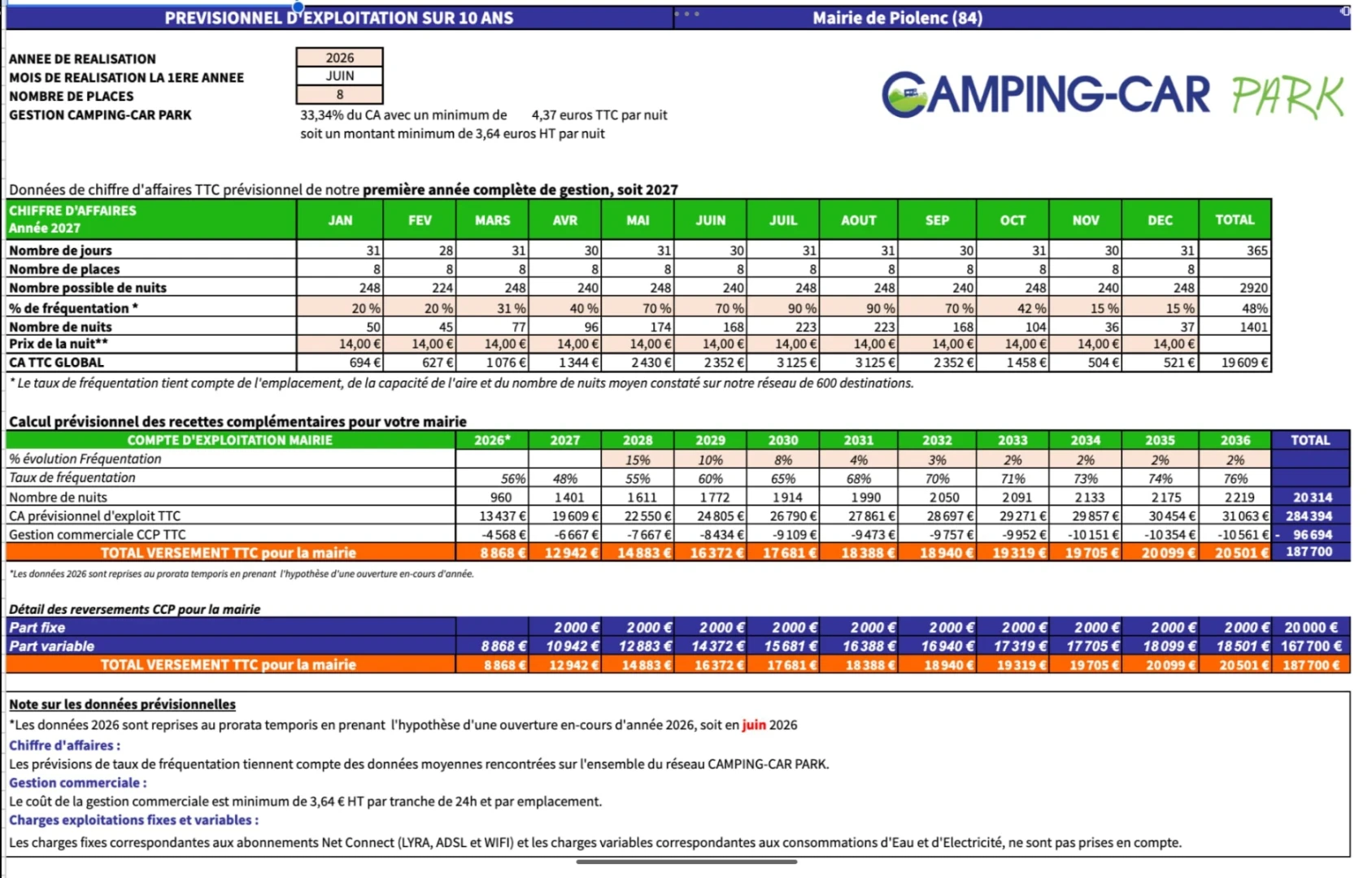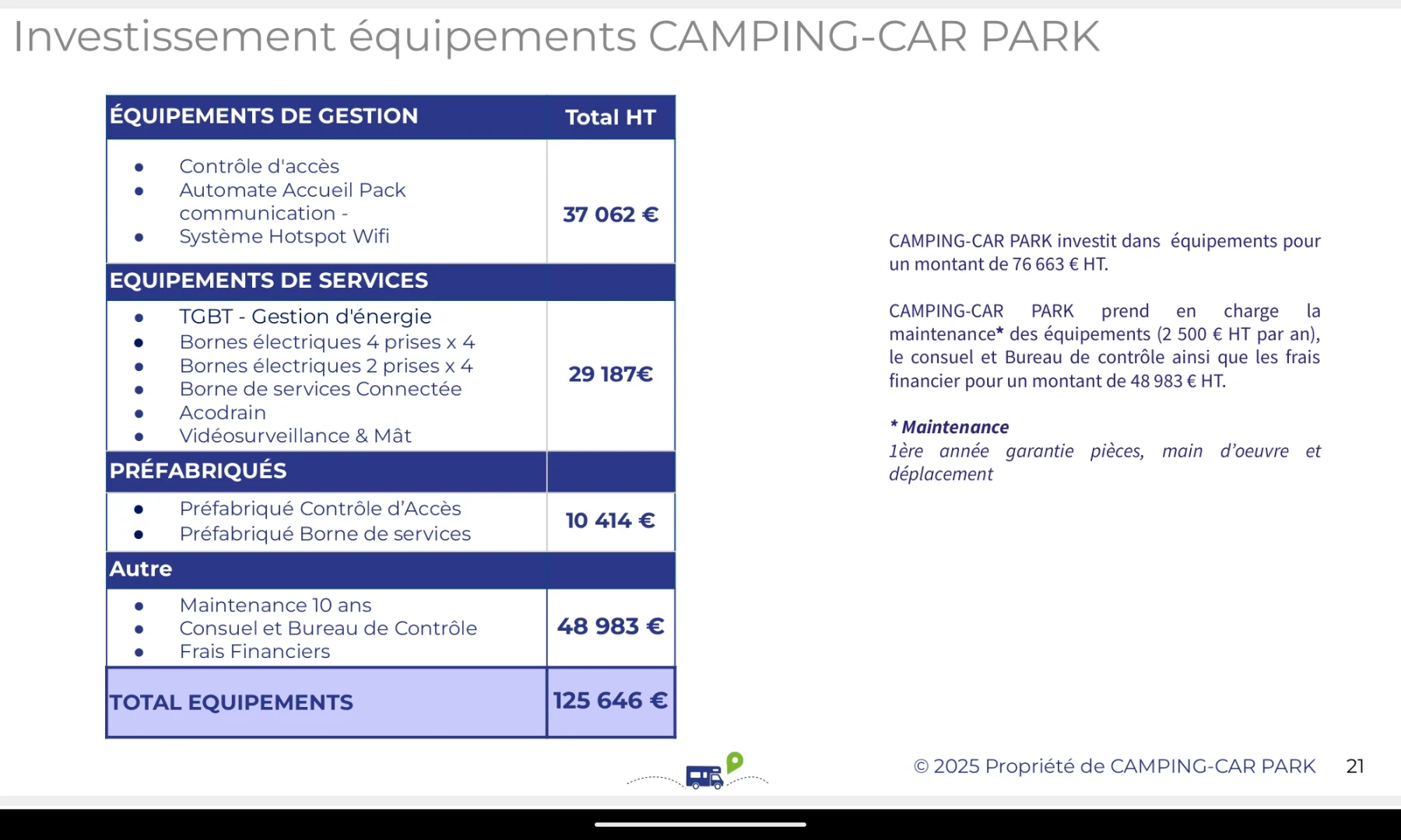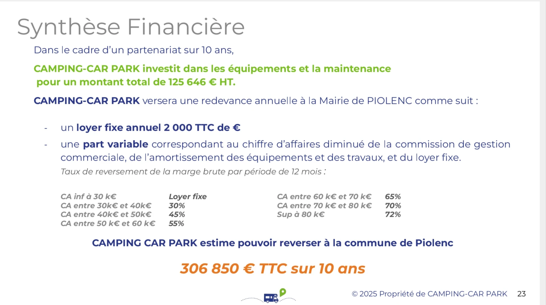 Nous avons déjà établi un partenariat prometteur avec un prestataire rencontré lors du salon des maires 2025, qui financera l'intégralité des travaux d'une de ces aires sur une période de dix ans de partenariat. Les travaux restant seront réalisés par des artisans locaux, garantissant une approche de développement durable qui respecte notre identité locale.